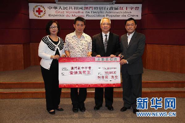 8月13日,澳門市民關(guān)偉霖向澳門紅十字會捐贈10萬澳門元,援助甘肅舟曲受災群眾。截至當日,澳門紅十字會共收到澳門社會各界向舟曲災區(qū)的捐款373.06萬澳門元。 新華社發(fā) (張金加攝)