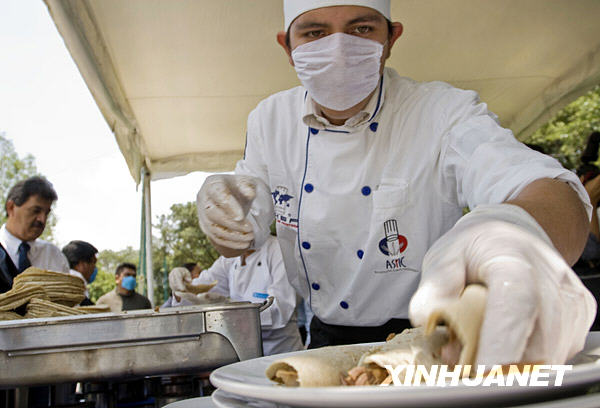 5月14日,在墨西哥首都墨西哥城舉行的新聞發(fā)布會上,廚師在制作玉米餅卷豬肉。墨西哥勞工部在當天舉行的新聞發(fā)布會上表示,吃豬肉或者豬肉制品是安全的,不會有感染甲型H1N1流感的風險。目前墨西哥市場上豬肉價格穩(wěn)定,銷售情況良好。新華社發(fā)(戴維攝)