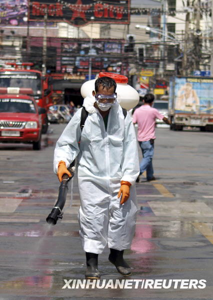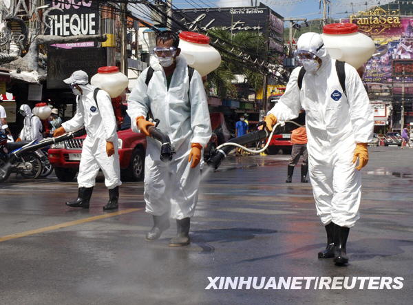 6月14日,泰國衛生工作人員在普吉島一處海灘附近噴灑消毒藥水。泰國衛生部當日宣布,泰國新確診甲型H1N1流感病例44例,這使得泰國甲型H1N1流感確診病例增至150例。新華社/路透