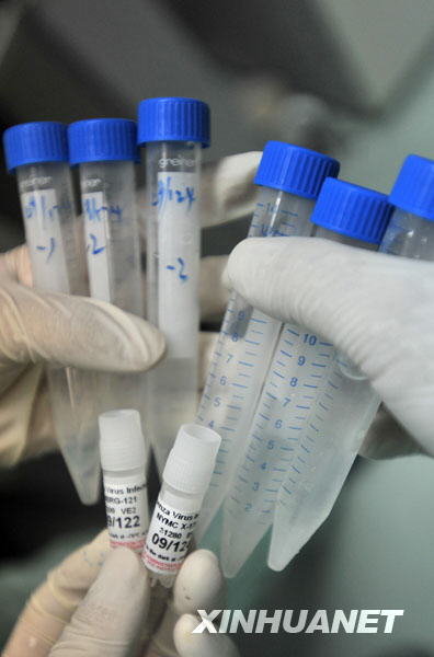 當日,由衛生部批準、經由世界衛生組織提供的6支甲型H1N1流感疫苗生產用毒株運抵武漢生物制品研究所,并于當天上午在該所實驗室進行擴增培養。7月底,將生產出疫苗原液,經過動物實驗和臨床I、II期實驗后,國慶節前有望生產出疫苗。新華社發(周超 攝)