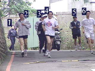 馬英九從山坡上跑下來,民眾報以熱烈掌聲,現(xiàn)在維安層級提升,最少六名隨護陪著跑