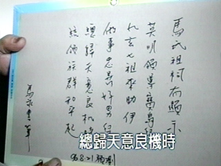 苗栗馬家祠堂祭祖,宗親拿出去年8月有人預測馬英九會當選做的打油詩,橫批剛好是“馬英九做總統(tǒng)”。