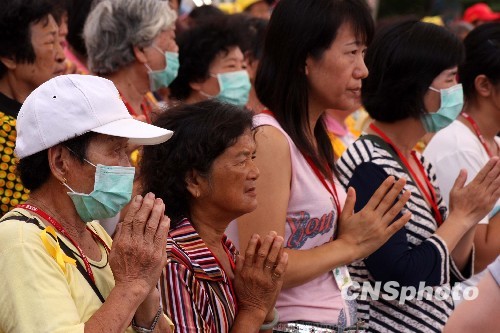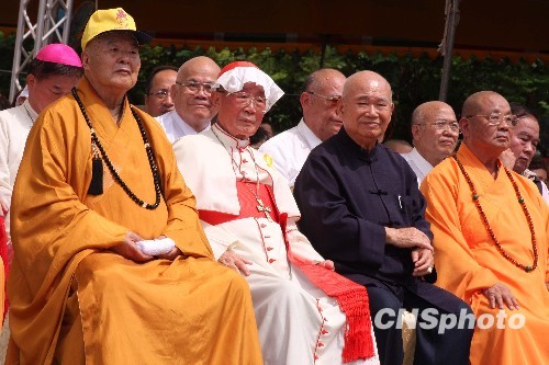 佛光山星云大師(左一)等臺灣宗教界領袖以及各界人士數千人,冒著烈日與會,共同悼念災區罹難者,為生還者祈福。中新社發 董會峰 攝
