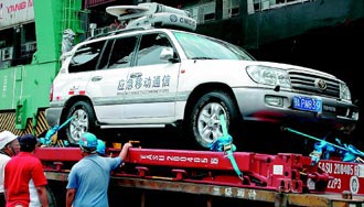 中國移動的衛星移動式基地臺車今天上午運抵高雄港。來源:臺灣《聯合晚報》