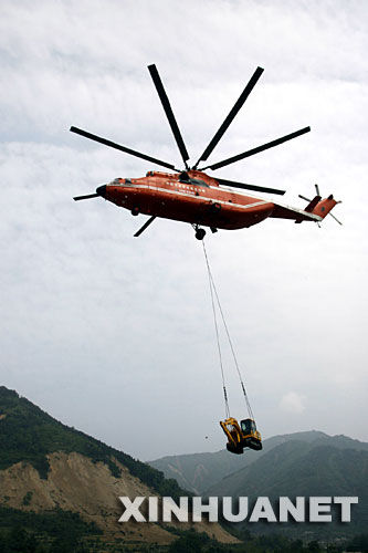 2008年6月2日,在四川省北川縣擂鼓鎮(zhèn),一架米-26直升機(jī)完成唐家山堰塞湖搶險(xiǎn)設(shè)備向外吊運(yùn)工作后離開。 圖片來源:新華社