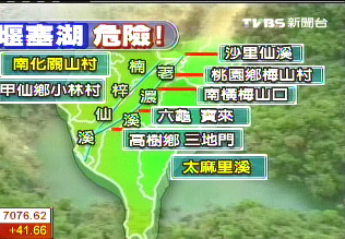 光是高屏溪上游就有8個(gè)堰塞湖潰堤,影響地區(qū)包括梅山、六龜、寶來、高樹、三地門、小林村等,至于南化關(guān)山村和臺東的太麻里溪?jiǎng)t是拉警報(bào)。 |