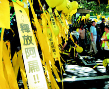 圖為挺陳水扁民眾昨天前往臺北看守所集結,在警方架設的拒馬上綁滿黃絲帶及氣球。圖片來源:臺灣《聯合晚報》