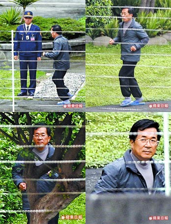 陳水扁進(jìn)入花圃后,先深深地吸了一口清新自由空氣,簡(jiǎn)單熱身后,就繞著花圃圓形水泥地,逆時(shí)針慢跑起來(lái)。為了避免發(fā)生意外,三名管理人員眼睛沒(méi)離開(kāi)過(guò)他,不敢有絲毫放松,其中一人還全程拿著DV錄像。