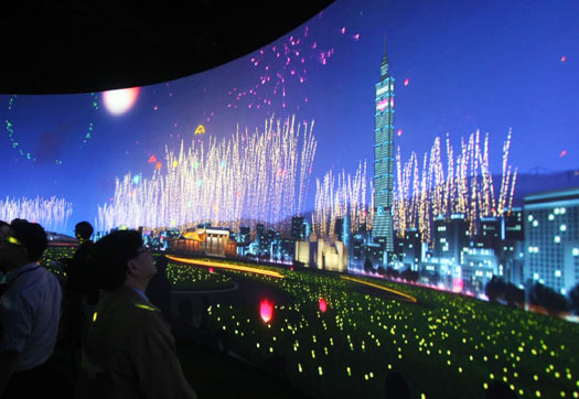 臺北花博夢想館3日舉行開幕儀式,受邀貴賓在環型劇場前觀看交互式影音動畫。圖片來源:“中央社”