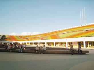 如何把全數21萬盆的草花擺上足球場的看臺,還要呈現出“七道彩虹”的圖案是個大工程。丁錫鏞說,考慮過擺設斜放的盆架裝置草花,也曾想過編置藤架供草花攀藤生長,后來決定在看臺搭設底座,然后依照圖案上色,種花的工人只要依照底座的顏色,把相對應的草花放進花盆中就錯不了。