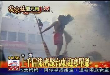 據(jù)了解,昨天的陣頭繞境是在臺東市的南北向道路上,今天則是東西向街道,今天晚間7時30分,隊伍將陸續(xù)進入臺東市天后宮表演“謝神”后解散;“炮炸寒單爺”今天還有7場次,最熱鬧一場是將于今晚7時在臺東海濱公園舉辦的“南蜂炮、北天燈、東寒單”的大會師。(云鵬) |