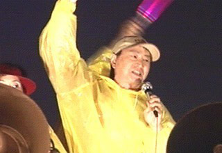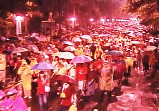 中國臺灣網9月16日消息 據臺媒報道,由臺“倒扁”總部發起的“915螢光圍城游行”在昨天傍晚6時正式出發。雖然臺島北部受到臺風影響,時雨時晴,但游行人群熱情不減,據稱有逾75萬之眾身著紅衣、手拿紅色熒光棒,在總指揮施明德的帶領下,對臺當局“總統府”和陳水扁的玉山寓所形成包圍之勢,“嗆扁”下臺,“阿扁下臺”的喊聲響徹臺北街頭。(云鵬)