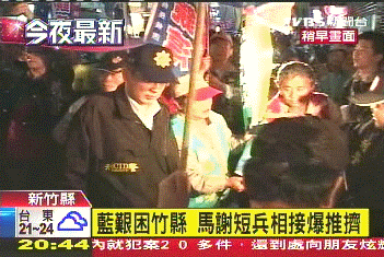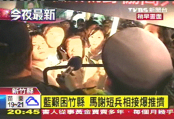 據臺灣TVBS電視臺報道,馬英九、謝長廷,各自帶著候選人掃街,沒想到半路上,狹路相逢,爆發沖突。綠營支持者不滿員警為了元首維安,在馬路上拿盾牌筑人墻,不讓拜票隊伍經過,情緒爆發。他們對著馬英九高喊:“為什么不能過去?為什么不能過?”混亂中還有人動手拉扯候選人旗幟,場面更加混亂。
