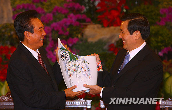 11月6日,馬英九在臺北賓館會(huì)見海協(xié)會(huì)會(huì)長陳云林一行。這是馬英九向陳云林贈(zèng)送禮品。新華社記者 邢廣利 攝