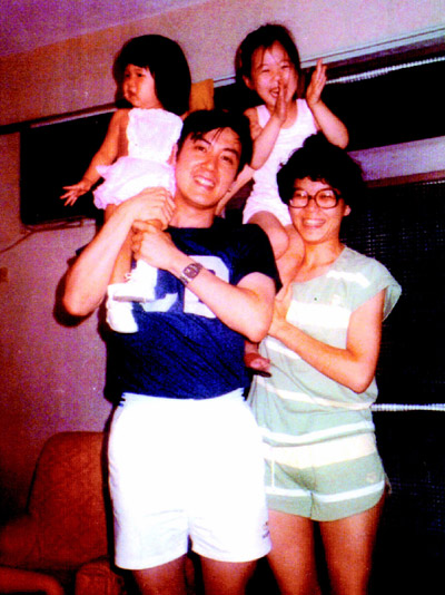 老照片:馬英九夫婦穿家居短衫短褲,將兩個(gè)女兒扛在肩上,大女兒馬唯中高興地拍手,享受平凡家庭的天倫之樂(lè)。