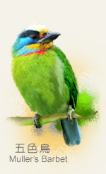 五色鳥,有人稱之為花和尚,因顏色鮮艷,其鳴聲甚似和尚敲打木魚咯咯作響,客家人則稱它叫啄樹鳥,五色鳥平日隱棲于中低海拔森林頂端,夜晚則棲于自己挖啄的朽木洞中,嗜食各種種子。