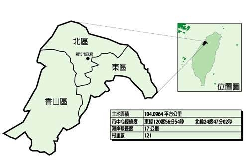 東 區 面積33.5平方千米,人口17.8萬。 北 區 面積15.7平方千米,人口12.9萬。 香山區 面積54.8平方千米,人口 6.6萬。