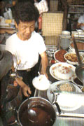 提到新竹小吃,馬上令人聯(lián)想到城隍廟。新竹城隍廟小吃在日據(jù)時(shí)代就已經(jīng)成形,當(dāng)時(shí)有“庶民味覺(jué)的殿堂”之稱,時(shí)至今日,這里仍然是新竹小吃的大本營(yíng),范圍涵蓋了城隍廟和法蓮寺前方的廣場(chǎng),與廣場(chǎng)外圍的東門街、中山路一帶,約50家攤子搭棚架瓦,把古跡級(jí)的城隍廟團(tuán)團(tuán)圍住,形成一個(gè)熱鬧的商區(qū),其中不乏三代相傳的知名老攤。 除了米粉、貢丸、肉圓三大新竹傳統(tǒng)小吃齊聚于此,魯肉飯、潤(rùn)餅、魷魚羹、蚵仔煎等亦別具滋味,工作賣力的攤主們從早餐賣到宵夜,24小時(shí)來(lái)這里都可以尋得美味,是新竹人吃三餐飽肚、游客品嘗新竹美味的必到之地。 廟口林家肉圓 電話:(03)522-9008 營(yíng)業(yè)時(shí)間:9點(diǎn)-24點(diǎn) 休息時(shí)間:每月最后一個(gè)周二 店內(nèi)特色:香菇肉貢丸、蔥肉肉圓、栗子肉圓、四神湯 正對(duì)城隍廟戲臺(tái)的林家肉圓,為祖?zhèn)魅睦系辏约t糟肉、蔥為餡料,裹上蕃薯粉、糯米合制的外皮,口味特殊,為新竹肉圓的正宗吃法。此外,用香菇、絞肉加蠔油、香料炒香后,再包進(jìn)肉漿制成的香菇肉貢丸,也是林家獨(dú)步的美食。而用小腸和薏米以文火煨透的四神湯,吃起來(lái)滑嫩不膩,灑上龍鳳酒,味道更加香醇,是搭配肉圓的上選湯品。 林家甜品 電話:(03)523-0343 營(yíng)業(yè)時(shí)間:09點(diǎn)半-21點(diǎn)半 休息時(shí)間:每月最后一個(gè)周二 店內(nèi)特色:綜合冰、紅豆牛奶冰  這是城隍廟唯一賣冰品甜點(diǎn)的攤子,紅豆綠豆、蓮子桂圓、花生麥角等古味十足的傳統(tǒng)配料,是讓小攤屹立60多年的重要功臣。不同于一般煮得糊爛的冰點(diǎn)配料,林家阿伯把綠豆、麥角煮得恰好熟透、顆粒分明,吃起來(lái)口感香綿。因?yàn)榭驮捶(wěn)定,冷熱甜品都有,所以即便冬天前來(lái),也不怕吃不到林家阿伯的“甜頭”。 王記蚵仔煎 電話:(03)521-5625 營(yíng)業(yè)時(shí)間:09點(diǎn)半-21點(diǎn) 休息時(shí)間:每月最后一個(gè)周二 店內(nèi)特色:蚵仔煎、肉燕湯、魚粳湯 采用每天清晨自嘉義東石運(yùn)來(lái)的蚵仔,是王記蚵鮮味美的秘訣,而蚵仔煎要好吃,最重要的就是地瓜粉勾芡的功夫,粉水比例恰當(dāng),煎起來(lái)才會(huì)軟中帶Q,表皮香脆;另外,王記的肉燕也很特別,尤其是燕皮的制作費(fèi)工,別處很難吃到;而湯鮮味美的魚粳湯,亦是吃蚵仔煎的絕妙搭配。  元祖潤(rùn)餅 電話:(03)522-2285 營(yíng)業(yè)時(shí)間:10點(diǎn)-21點(diǎn)半 休息時(shí)間:每月最后一個(gè)周二 店內(nèi)特色:潤(rùn)餅 創(chuàng)店80多年、傳承五代的郭家潤(rùn)餅,是新竹地區(qū)的潤(rùn)餅老店,因知名度頗高,故攤前常見大排長(zhǎng)龍的盛況。其與眾不同之處,在于用梨山高麗菜、紅蘿卜、白蘿卜炒香后,鹵制成口味獨(dú)特的鹵菜,加上蛋酥、菜脯、沙豆干、香菜、花生粉、豆芽等多種配料,再用香Q帶勁的自制餅皮包起來(lái)卷上,既快速又好吃,無(wú)怪乎甚受大眾喜愛(ài)。