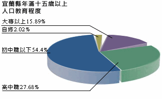 宜蘭縣人口數(shù)近47萬(wàn)人,滿十五歲以上人口約37萬(wàn)人,其中教育程度狀況,大專以上15.89%、高中職27.68%、初中職以下54.4%、自修2.02%;至于就業(yè)人口行業(yè)分配狀況為初級(jí)行業(yè)9.2%、次級(jí)行業(yè)36.2%、三級(jí)行業(yè)54.6%,和全臺(tái)的平均值初級(jí)行業(yè)7.8%、次級(jí)行業(yè)37.2%、三級(jí)行業(yè)55.0%,相當(dāng)接近。
