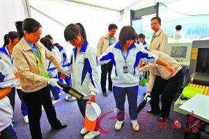 昨日上午9時40分左右,記者在東莞體育館門口看到了數百名學生排成的長隊。據帶隊老師介紹,這些身著校服的學生是今早觀眾入場演練的“主角”——模擬觀眾。據介紹,這些模擬觀眾都是來自南城職業中學的學生!按蠹s有500人左右!蹦铣锹氈袔ш犡撠煹臈罾蠋煾嬖V記者。