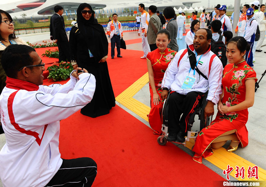 10日下午,廣州亞運城升旗廣場上,參加亞殘運會的一名選手邀請身著旗袍的禮儀小姐合影。中新社記者 柯小軍 攝
