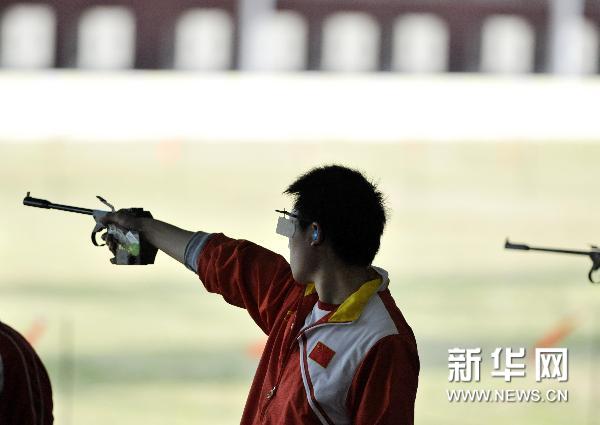 11月13日,中國選手伍晶在男子50米手槍比賽中。當日,在第16屆亞運會射擊項目比賽中,中國隊獲得男子50米手槍團體亞軍。新華社記者陳曄華攝