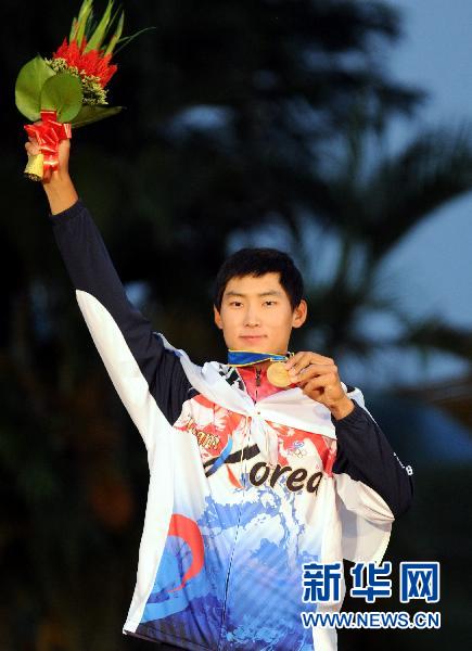 11月20日,韓國球手金珉輝在頒獎儀式上。當日,在第16屆亞運會男子高爾夫球個人賽中,金珉輝以總桿273桿,低于標準桿15桿的成績奪得冠軍。新華社記者楊世堯攝