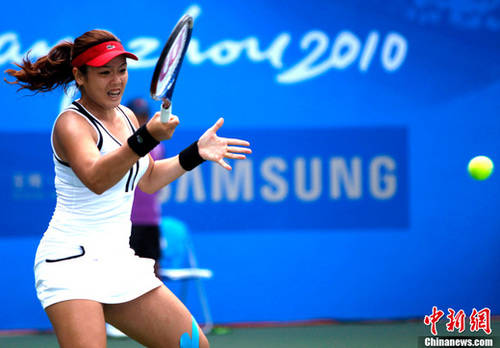 第十六屆廣州亞運(yùn)會網(wǎng)球雙打決賽11月22日結(jié)束,中華臺北選手詹詠然/莊佳容獲得女雙冠軍。圖為詹詠然擊球。 中新社記者 趙振清 攝