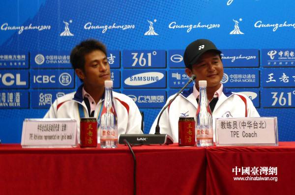 中華臺北軟式網球男隊教練方同賢(右)與“首金”功臣劉家綸在賽后出席新聞發布會(中國臺灣網 李徽 攝)