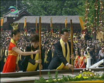 連戰(zhàn)一行于4月16日下午抵達鄭州,18日晚出席了丁亥年黃帝故里拜祖大典歡迎晚宴并欣賞拜祖大典音樂會。今天,連戰(zhàn)夫婦在中共中央臺辦主任陳云林的陪同下入場,并為大典題字。大典開始后,佩戴黃帝絲巾的連戰(zhàn)夫婦齊步趨前,恭敬地向黃帝像敬獻花籃,并凈手點火上香,鞠躬參拜。