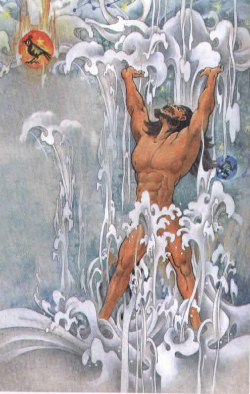 關于盤古的神力,還有傳說。他哭泣時流的眼淚成了江河,眼睛的閃光變成閃電。說他一歡喜,就是麗日晴天;一惱怒,天空就烏云密布。還說他睜開眼睛就是白天,閉住眼睛就是黑夜。