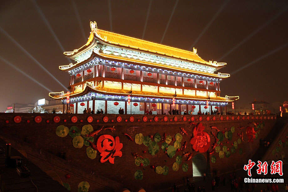 1月26日晚,“西安大廟會·城墻上元燈會暨成都國際熊貓燈會”在西安點亮。圖為流光溢彩的燈會。中新社發 金鑫 攝