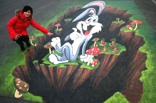 在南京玄武湖公園里,彩繪藝人在公園的主干道上創(chuàng)作的“兔八哥”三維立體彩繪受到了游人的喜愛,人們紛紛停下腳步,拍照留念。