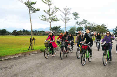 長發披肩、皮膚黝黑的導游阿度與我們相識在腳踏車上,我們跟隨他騎車踏訪臺東縣鹿野鄉的田園山水。阿度邊騎車邊指著周圍起伏的山巒說:“右手是中央山脈,翻過去就是臺灣海峽,度過海峽就是中國大陸。左邊是海岸山脈,越過去就是浩瀚的太平洋。”在果田邊,阿度興奮地喊道:“這是鳳梨、釋迦、木瓜、枇杷……都是臺灣最好吃的水果,在這里可以吃到樹上熟的水果,水多汁甜。”