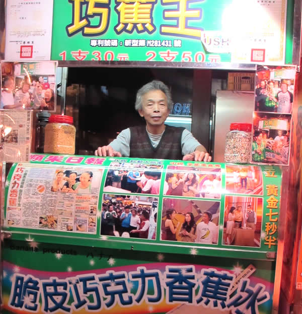 在臺灣逢甲夜市你可以品嘗到這個號稱全球首創的脆皮巧克力香蕉冰,據說這個巧蕉王是通過專利認證的名牌小吃,多次登上報紙雜志,攤主老爺爺很有明星氣場。張春彥攝