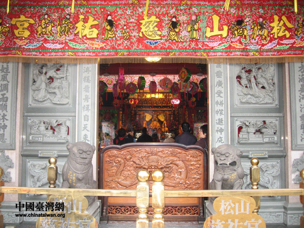 松山慈佑宮大殿門口,里面經常人潮洶涌。
