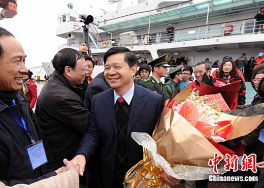 2月16日,農歷正月十四下午,出席第九屆“兩馬同春鬧元宵”系列活動的馬祖縣長楊綏生、馬祖知名人士曹爾忠一行,乘坐“臺馬輪”經“兩馬”航線抵達福州港馬尾客運站,受到當地熱烈歡迎。中新社記者 劉可耕 攝