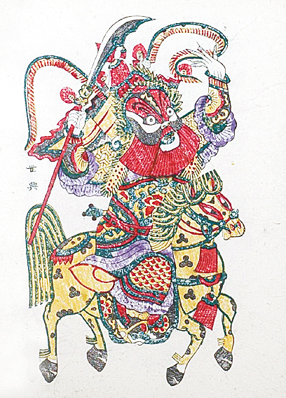 鳳翔年畫是西北地區的代表性年畫,源于宋盛于清,是千百年來西北地區民俗民情的藝術反映。在雕刻藝術上,鳳翔年畫繼承了秦漢唐宋石刻和壁畫藝術端莊樸實、凝重大方的特點,揉進了本地刺繡剪紙的造型技巧,并借鑒了秦腔的表演藝術風格,強調夸張和變形,畫面粗獷豪放而又鮮活靈動。鳳翔年畫工藝流程復雜,從畫墨線稿到印刷要經過十三四道工序。由于地處西北受外部影響少,它保持了古版年畫的純粹民間風格,無論是人物還是花卉,造型都生動逼真。例如騎馬的秦瓊門神畫就吸收了秦腔臉譜的變形藝術,人物雙眉直豎、雙眼噴火,下巴夸張變寬,具有殺氣騰騰、鎮妖除邪的威風感。