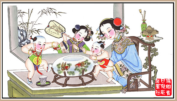 由于朱元璋提倡過新年要貼春聯(lián),這樣發(fā)展下來,年畫也就特別發(fā)達起來。今日被保存下來的,還有明萬歷年間最流行的彩色套印的木刻福綠壽三星圖、天官賜福圖等,刻工頗精致,迄今仍為民間所師法。還有實用的歷畫,如:春牛、灶馬、芒神等;更有歷史故事的“孟母教子”、“岳飛槍挑小梁王”。“牛郎織女”,“白蛇傳”等。至于三國演義、水滸等古典文學(xué)名著,也被采用作年畫題材。及至明末崇禎間,天津楊柳青的年畫極為馳名,圖畫內(nèi)容也愈見豐富。