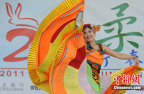 當(dāng)?shù)貢r間1月22日,距離農(nóng)歷新年還有10來天,洛杉磯華人聚集的柔似蜜市舉辦2011年新春游園會,吸引眾多當(dāng)?shù)厝A人和各族裔民眾參加。圖為游園會上的華人舞蹈家表演傳統(tǒng)民族舞蹈。中新社發(fā) 張煒 攝