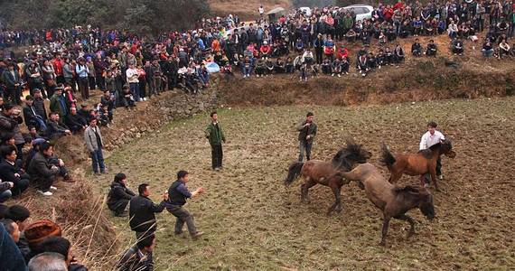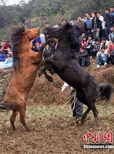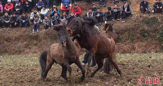 2月8日,廣西融水縣安太鄉(xiāng)培地苗寨舉行斗馬比賽。近20匹駿馬激烈的咬、踢、追等扣人心弦的格斗,吸引眾多游客到場觀看。“斗馬”已有500多年歷史,是當?shù)孛缱逋麨椴脹Q婚姻而設,現(xiàn)演變?yōu)橐豁棅蕵坊顒印}埩种?攝 圖片來源:CNSPHOTO
