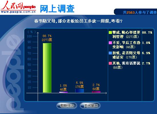 截至26日23時,共2563人參與了調查,其中88.7%共2273名網友表示支持“贊成,貼心舉措更利管理”;6.9%的網友認為“擔憂,是否陪父母難證實”;還有1.8%的網友認為“不妥,節后工作恐受影響”;最后,有2.7%的網友表示“其他,我有話要說”。