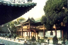 南華寺位于曲江縣馬壩鎮(zhèn)。據(jù)明萬歷《曹溪通志》記載:南朝梁武帝天監(jiān)元年(502),印度高僧智藥三藏見此地“山水回合,峰巒奇秀,嘆如西天寶林山也”,遂建議地方官奏請(qǐng)武帝建寺。天監(jiān)三年(504),寺廟建成,梁武帝賜額“寶林寺”。唐儀鳳二年(677)始,中國佛教南派禪宗創(chuàng)始人六祖慧能來寶林寺說法37載,使南宗禪法大播于天下。故南華寺素有南禪祖庭之稱,還與嵩山少林寺并稱為禪宗祖庭,在東南亞佛教國家有重要影響。武則天萬歲通天元年(696),武則天賜慧能水晶缽盂、磨衲袈裟等物。唐神龍?jiān)辏?05),中宗又賜寶缽、磨衲袈裟等物,并將寺名賜改為中興寺;神龍三年(707)再改法泉寺。宋開寶元年(968),太祖賜額改稱南華寺,沿稱至今。1983年,南華寺被確定為全國重點(diǎn)寺廟。今南華寺占地總面積約42.5萬平方米,主體建筑群總面積1.2萬平方米。為階梯式中軸線對(duì)稱平面布局。寺向?yàn)樽背稀V休S線上由南至北依次為曹溪門(頭山門)、放生池(上筑五香亭)、寶林門(二山門)、天王殿、大雄寶殿、藏經(jīng)閣、靈照塔、祖殿、方丈室。自天王殿始作封閉,東側(cè)依次為鐘樓、客堂、伽藍(lán)殿、齋堂等;西側(cè)依次為鼓樓、祖師殿、功德堂(亦稱西歸堂)、禪堂、僧伽培訓(xùn)班等。主體建筑院落外,北側(cè)有卓錫泉(俗名九龍泉)、伏虎亭、飛錫橋;西側(cè)有無盡庵、海會(huì)塔、虛云和尚舍利塔;東側(cè)有中山亭。