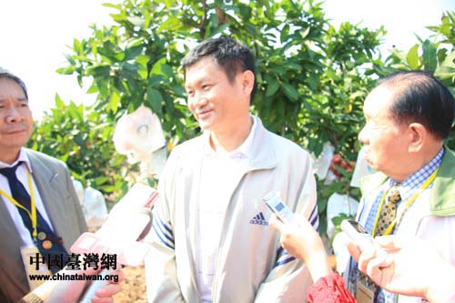 黃益豐在自己的蓮霧園里向兩岸記者介紹公司的發展情況