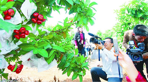 11月29日,在海口市臺資企業金德豐蓮霧基地,兩岸新聞媒體記者紛紛拍攝蓮霧果。( 海南日報 李英挺 攝)