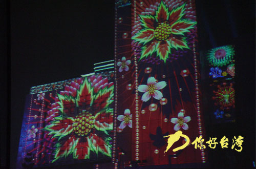 以上三幅圖片為本網(wǎng)記者在記者會現(xiàn)場,從屏幕上拍下的畫面——燈光投影下的臺北市政府大樓墻面(你好臺灣網(wǎng) 葉進華 王小珍 攝)