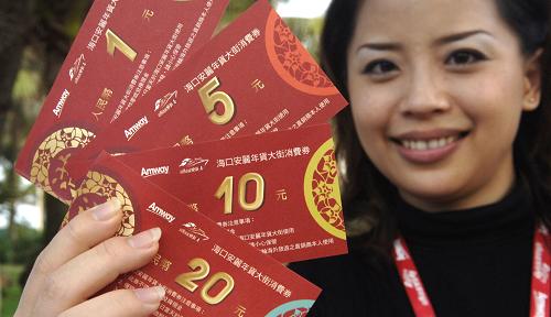 2月8日,臺灣游客在展示年貨購物券。當(dāng)日,1600多名臺灣游客搭乘排水量7萬噸級的豪華郵輪“海洋神話號”抵達海南省省會海口市參觀游覽。為使臺灣游客直觀地感受海南,海南省旅游部門專門為臺灣游客開設(shè)了年貨大街和迎春會,將海南特產(chǎn)、美食和少數(shù)民族文化藝術(shù)集中一地,供臺灣游客購買、品嘗、觀賞。新華社記者 趙穎全 攝