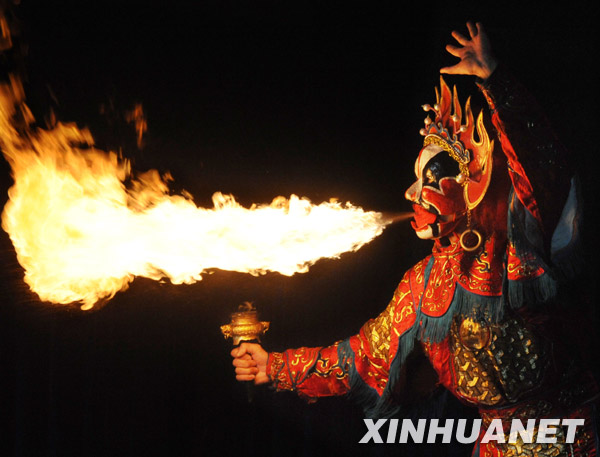 2月19日,來自四川成都的演員在臺北海峽兩岸宗教文化藝術觀光節上表演噴火絕技。