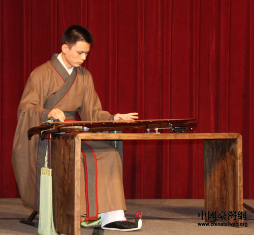 北京孔廟和國子監博物館工作人員為兩岸師生表演古琴。(中國臺灣網 李杰 攝)