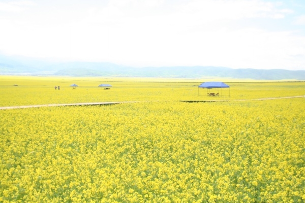 青海新聞網(wǎng)訊 (實習記者 劉成鵬 門源報道) 在曲尕者山下,一條懸架于花海之上的棧道,將遠道而來的游客送入了花海的腹地。沁人的芳香,輕松的樂曲,純正的蜂蜜水,四周群花環(huán)抱,游人們依亭而坐,盡情享受起了花海芬芳的沐浴。拍照、嬉戲、喝茶、閉目獨享,將自己置身于花海的芬芳之中,與自然相融。游人們在這里不僅領略著油菜花的美麗、油菜花的醉人和油菜花的壯觀,還能品味到皇城牧場上獨特的藏式大餐……